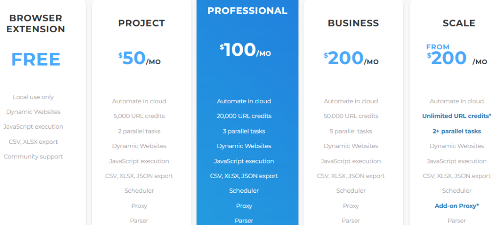 Pricing depends on exported data volume and the number of parallel processes. Entry-level tiers suit learning and routine content monitoring; professional tiers fit e-commerce and marketing research, review analysis, SEO audits, and competitive tracking.