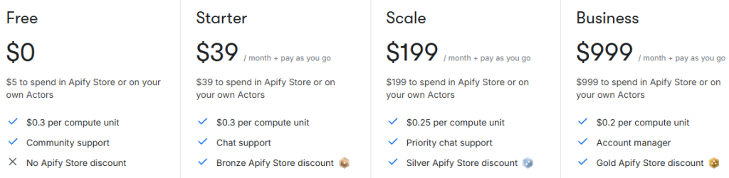 Apify pricing is based on Compute Units (CU)–a measure of compute time, memory, and network operations. This makes billing flexible: companies pay for actual resources used, not raw request counts.