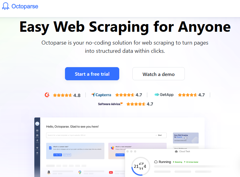 Octoparse is a hybrid no-code platform combining a local application with cloud resources.