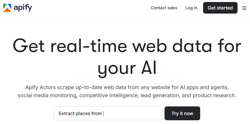Apify is an enterprise-grade cloud scraper for web scraping and workflow automation. It combines low-code convenience with the flexibility of custom scripts.