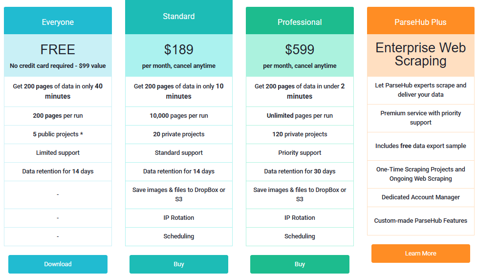 Performance is bounded by your plan–concurrent processes and pages per run. For larger business scenarios, ParseHub Plus adds scaling and support from the vendor’s team.