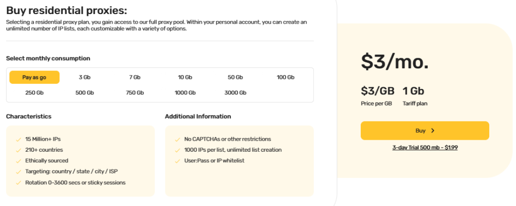 On pricing, I’d read their “from” numbers as volume benchmarks, not what most small teams pay on day one. In practice, entry usage tends to land closer to ~$3/GB, while bigger contracts can push rates down toward ~$0.70/GB. They offer a low-risk entry point too: a 3-day trial for $1.99 with 500 MB of traffic. It is enough to validate rotation behavior on real targets.