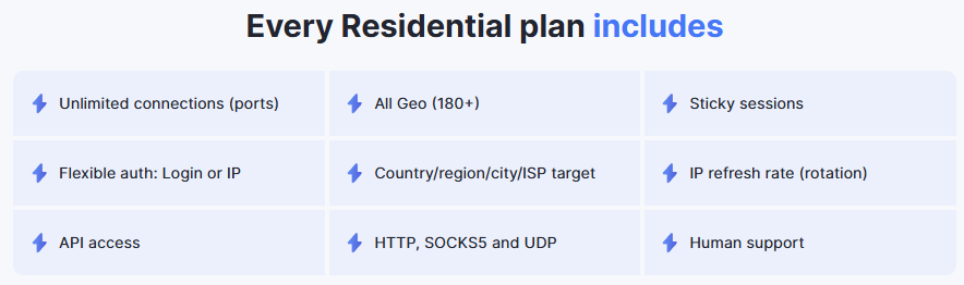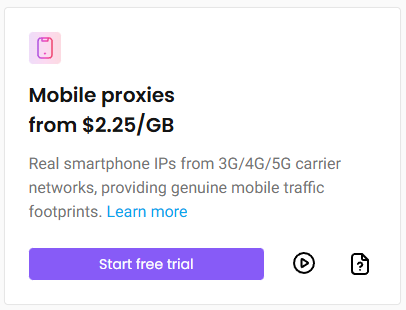 | SOAX | Credit-based pricing: $3.60/GB on the 25GB starter ($90/mo). Trial: 3-day with 400 MB traffic for $1.99 | Same credit pool applies (you allocate credits across proxy types).Trial: 3-day with 400 MB traffic for $1.99 | I like it when I want one wallet to cover multiple proxy types without juggling separate plans. |