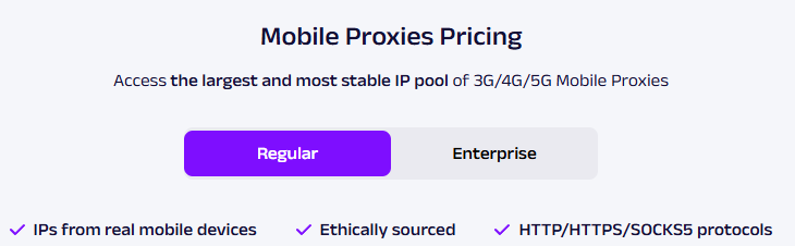 For rotating mobile, pricing depends on the allocation model. Shared options start at $10/IP, while dedicated proxies start at $25+. That split matters if you care about isolation and steadier behavior during sensitive flows.