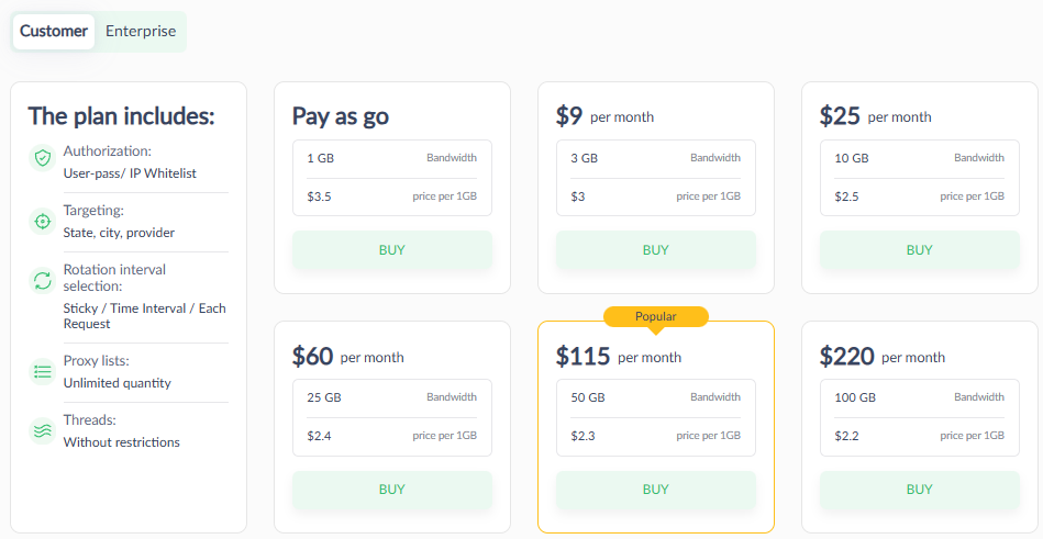 When I reviewed Geonix specifically for rotating solutions, two things stood out right away: the pricing structure and the control surface. Their residential plans start at $3/GB, but large enterprise volumes can push the effective rate down to ~$0.70/GB. That pricing ladder makes a difference when retries and payload size start driving real spend.